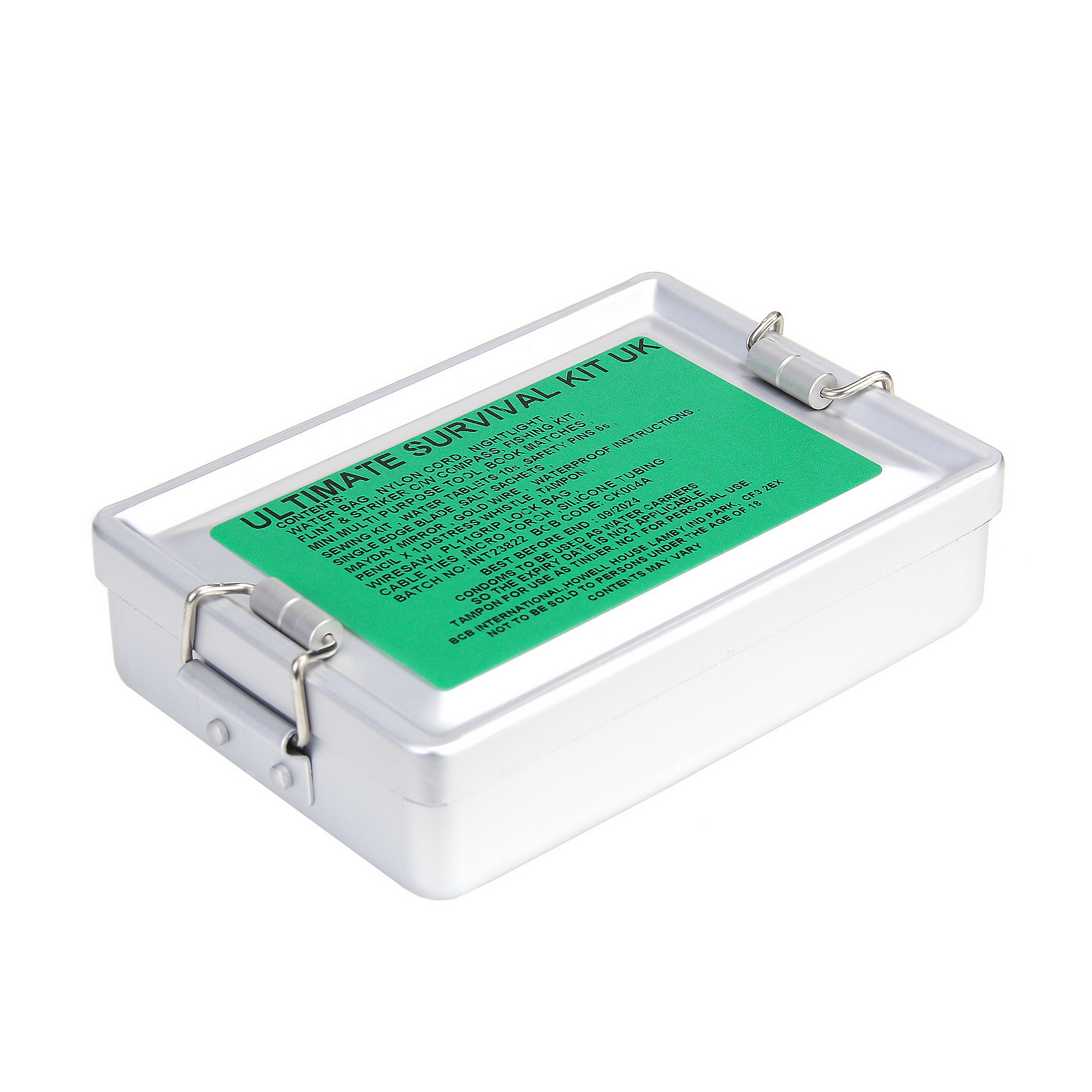 Wasserbeutel, Nylonschnur, mini Kompass, Kerze, Feuerstein & Zunder, Fischer-Set, Mini-Mehrzweckwerkzeug, Streichhölzer, Näh-Set, Wassertabletten, Sicherheitsnadeln, Rasierklinge, Salz Sachets, Signalspiegel, Golddraht, Bleistift, Signalpfeife, Tampon (als Zunder zu verwenden), Drahtsäge, wieder-verschließbarer Kunststoffbeutel, wasserdichte Gebrauchsanweisung.